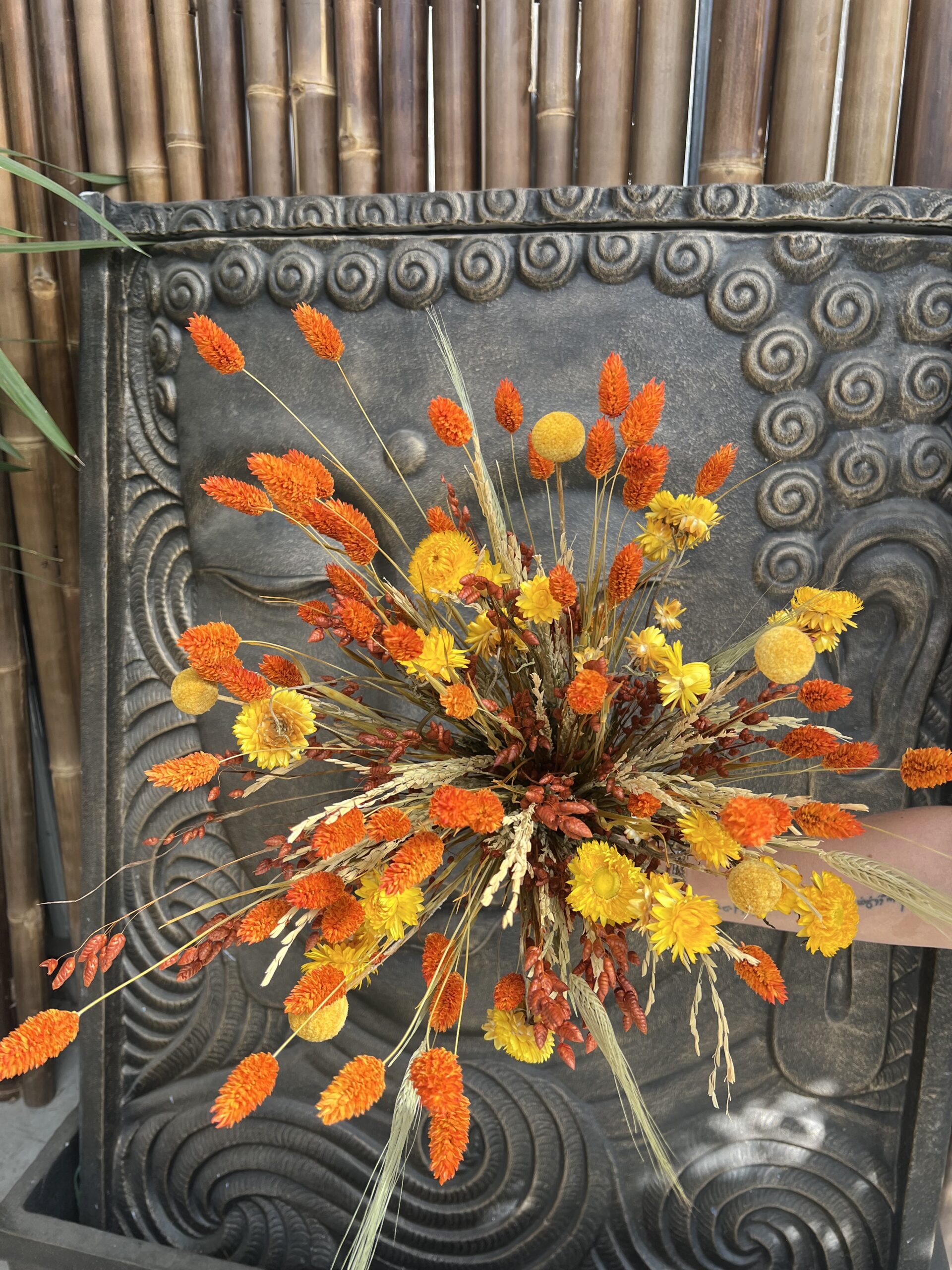 Ce bouquet de fleurs séchées est composé d’une sélection de fleurs séchées aux tonalités oranges jaunes, évoquant une touche automnale.