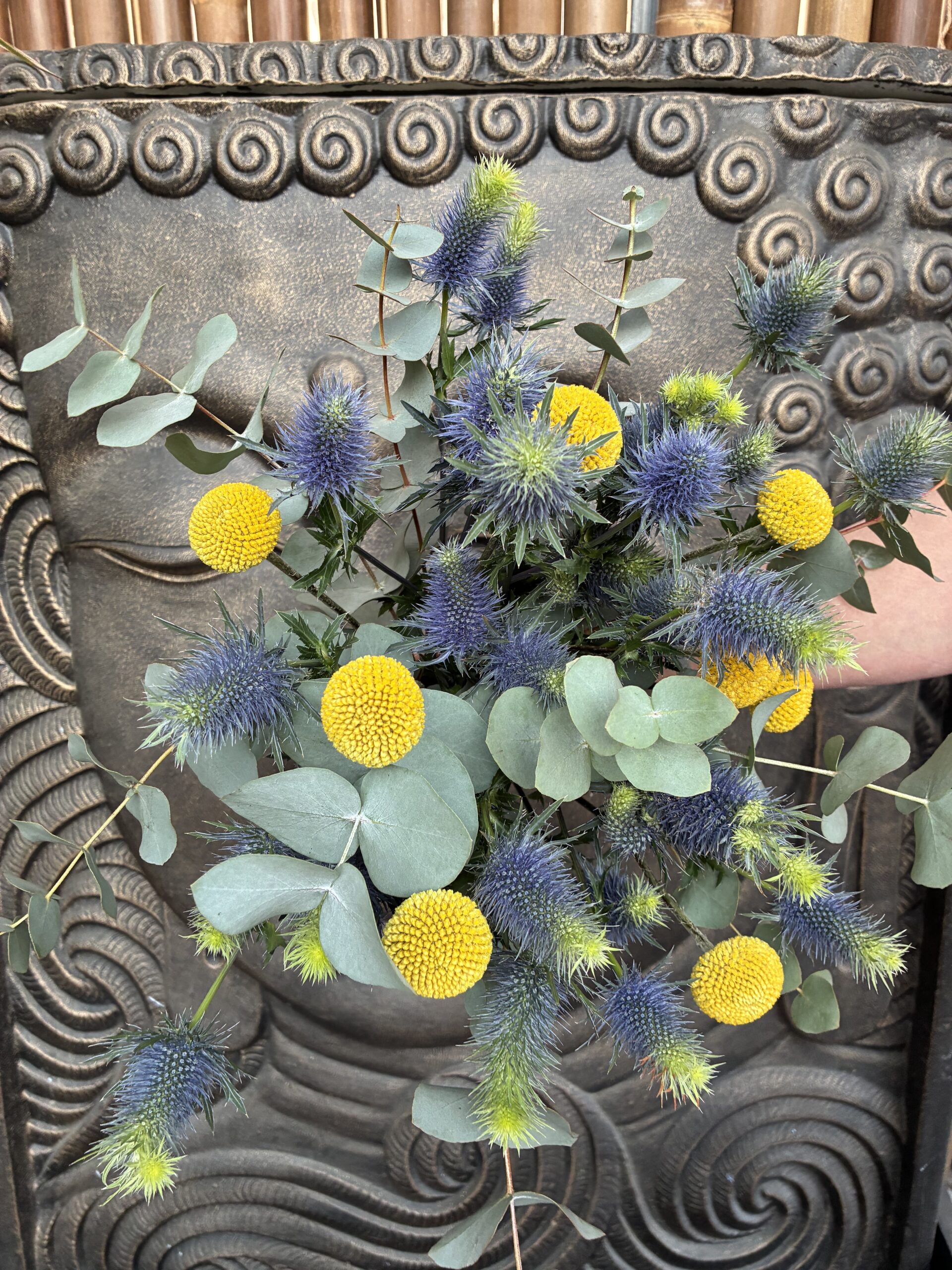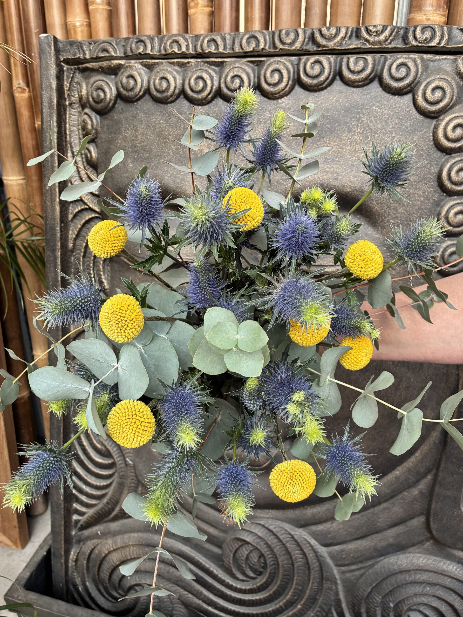 Très joli bouquet frais à faire sécher composé de Craspedia, Chardon et Eucalyptus qui peuvent sécher facilement.