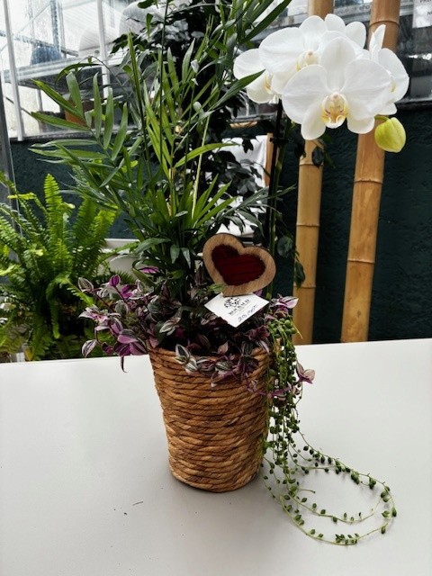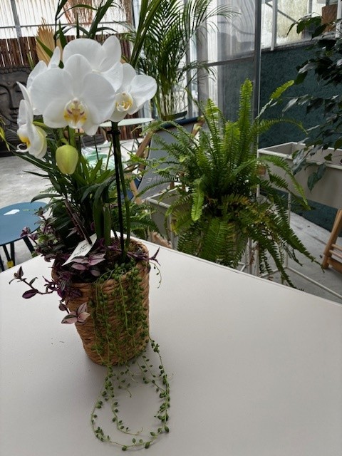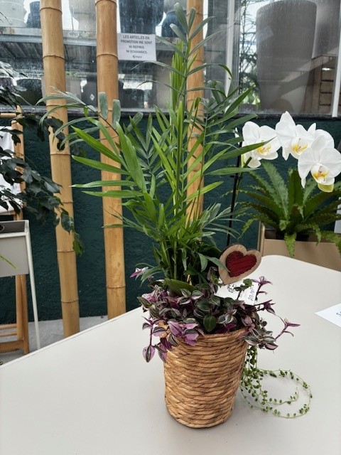 Composée dans nos ateliers à l’aide d’une orchidée et de plantes vertes, cette composition sera une excellente idée cadeau, (tout pourra être replanté après la floraison).