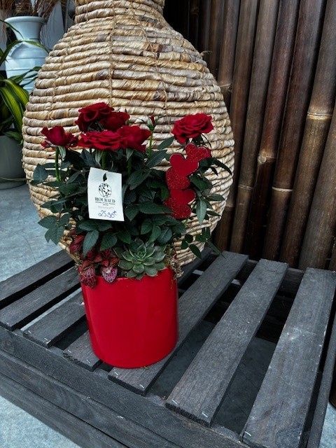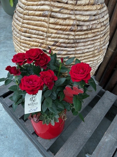Composée dans nos ateliers à l’aide d’un mini rosier rouge symbolisant l’AMOUR, d’une plante verte et d’une plante grasse, cette composition sera une excellente idée cadeau, (tout pourra être replanté après la floraison).
