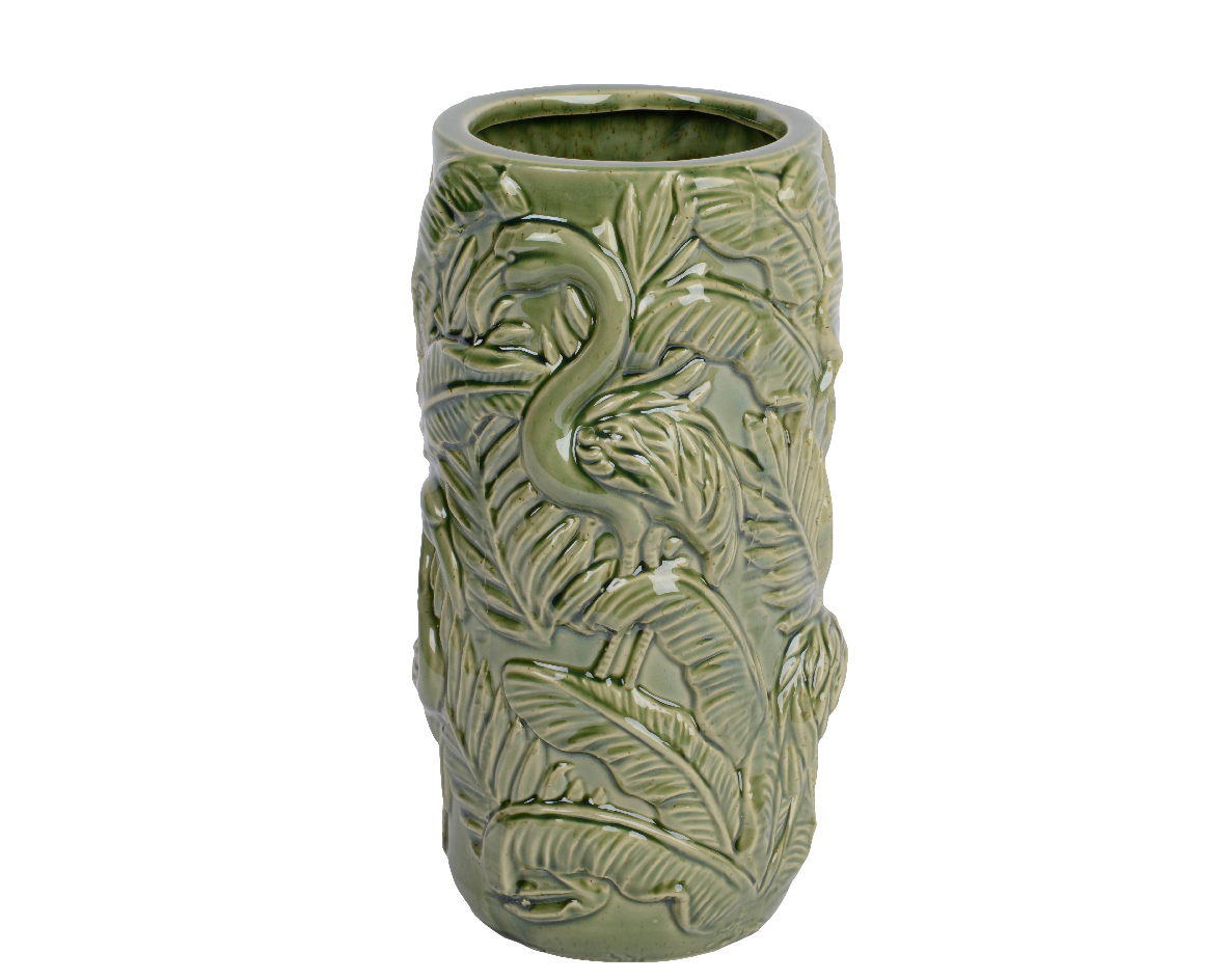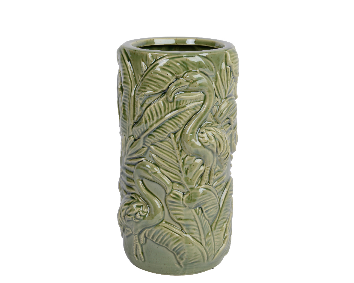 Craquez pour ce vase en porcelaine verte , les reliefs feuilles et flamants donneront un impact visuel fort et donneront à votre décoration du caractère.
