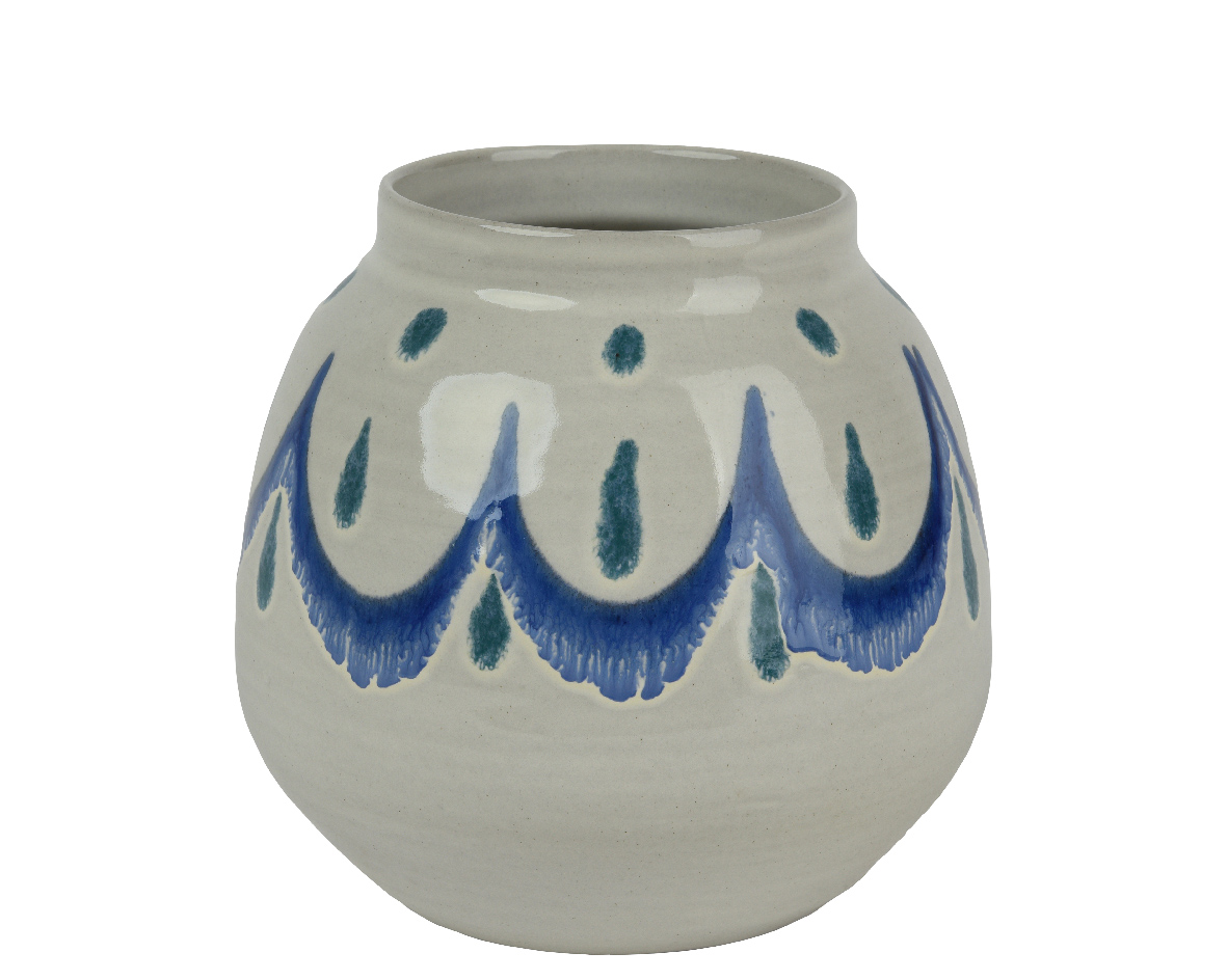 Cet élégant vase en terre cuite blanc et bleu avec une touche de vert séduira par son design classique et sa finition de qualité. Avec sa large panse et son ouverture élancée, il est parfaitement adapté pour mettre en scène avec style de généreuses compositions florales.